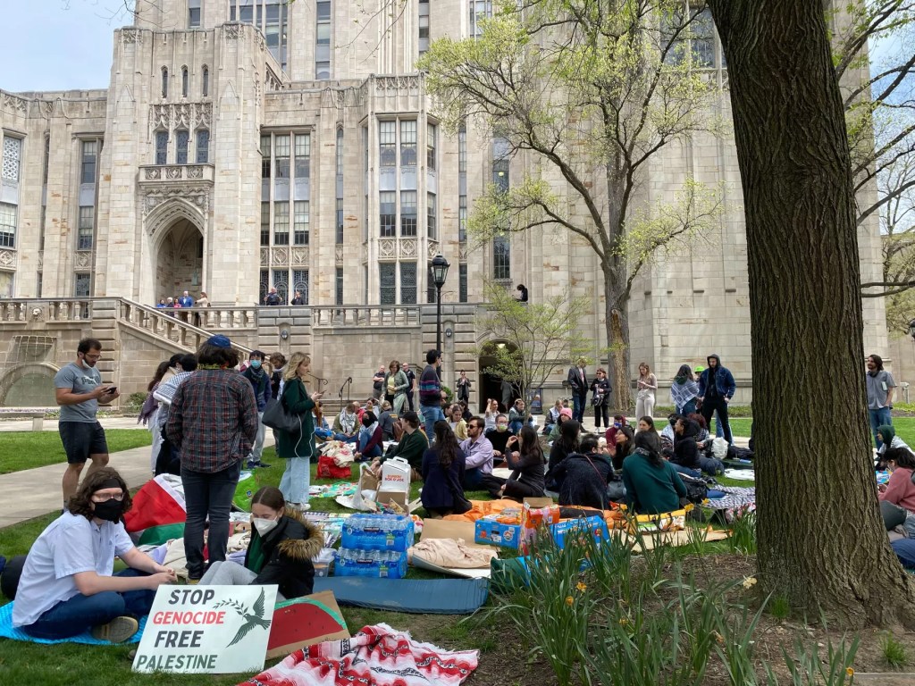 Designating the sit-in as a “liberated zone,” the students are demanding that Pitt disclose and divest from any investment ties it has to the Israeli government, reject normal relations with Israel including Israeli universities and acknowledge what the students refer to as the “ongoing genocide in Gaza.”